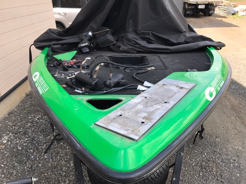 TOP50の二戦目が行われる弥栄ダム用にボートの準備を開始!弥栄ダムはエレキのみ使えるフィールドなので、ボートはサウザー君。
